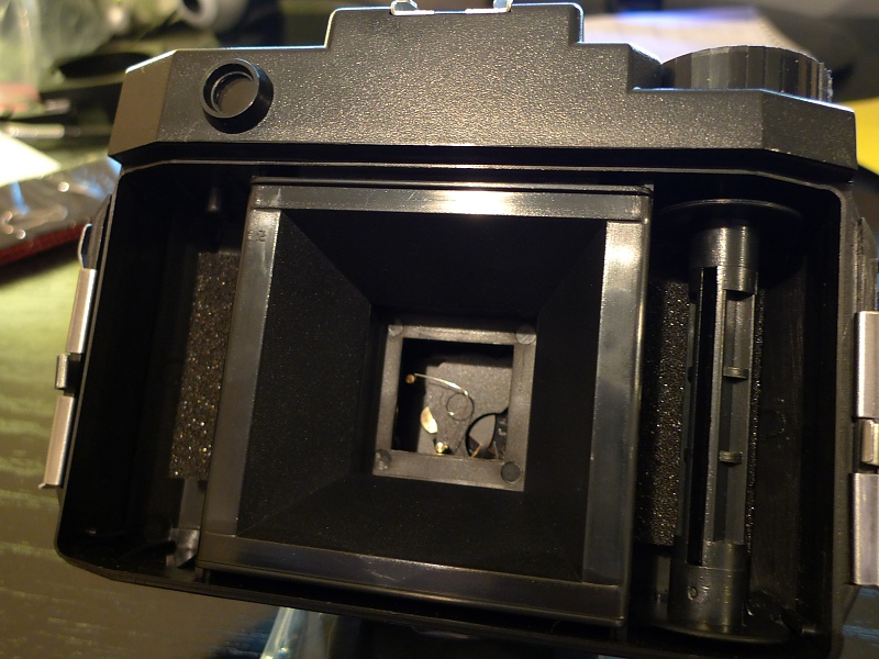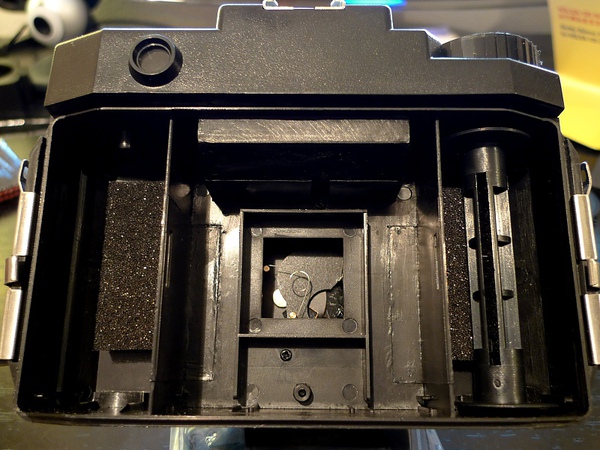 (上)相機內部左邊放底片 右邊是把他捲進去的